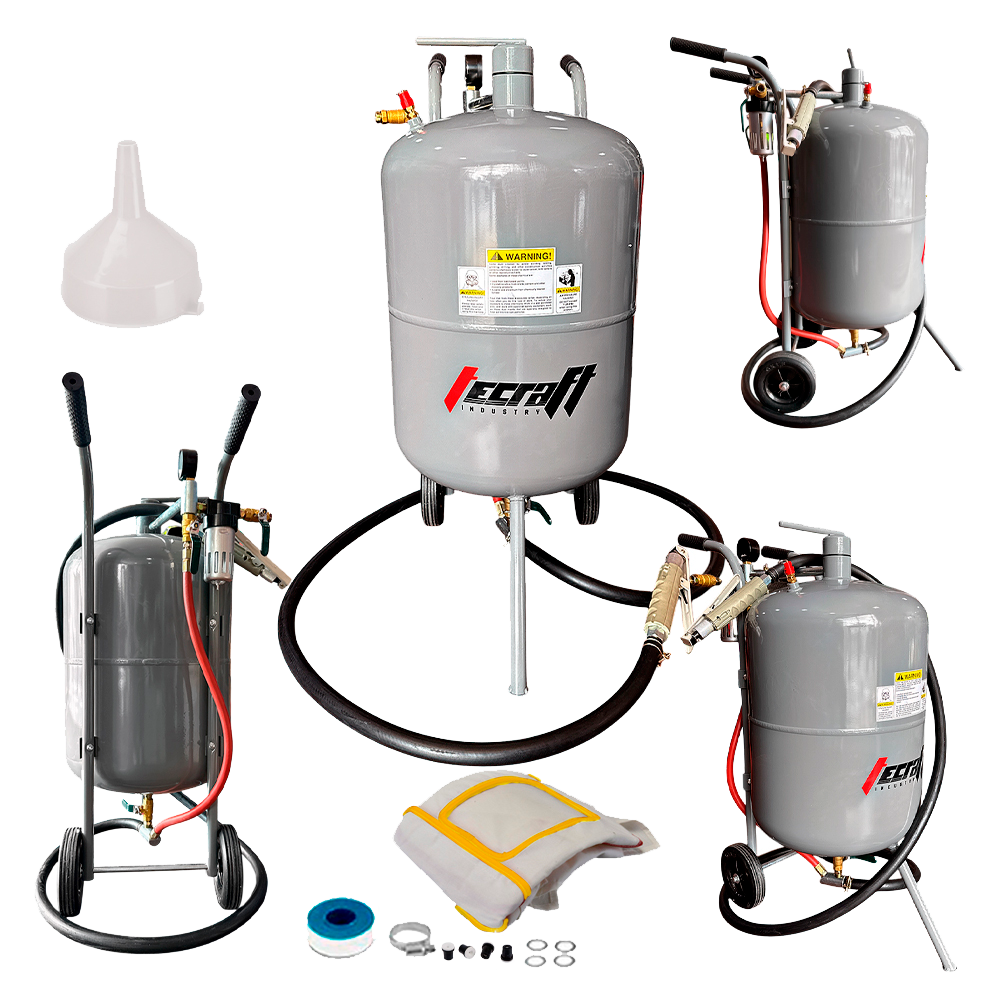 Maquina de Chorro de arena a presión de 20 Galones, equipado con una válvula de cierre, manómetro, boquillas, manguera de 2,5 metros, túnel de llenado, separador de agua..